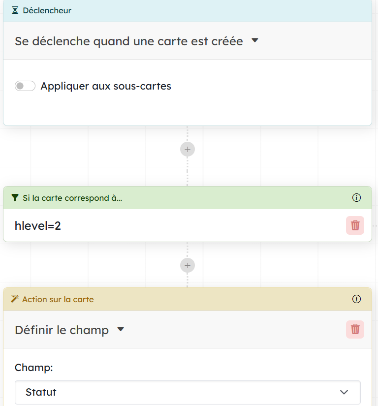 Dans cette configuration, l’action sera déclenchée uniquement lorsque des sous-cartes de niveau 1 sont créées.