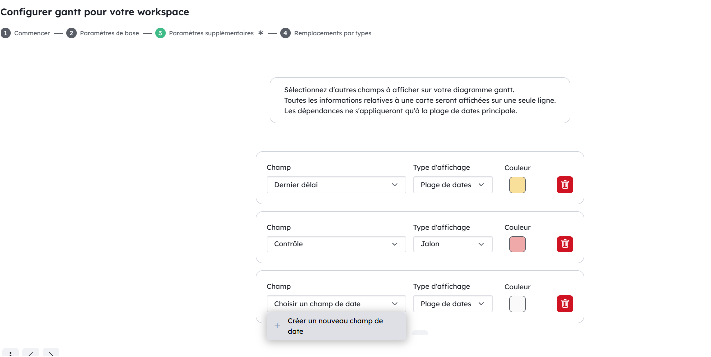 Vous pouvez désormais afficher plusieurs champs dates (en + des jalons) en vous rendant dans Apparence / Configurer Gantt / 3)Paramètres supplémentaires. Si le champ Date à afficher n’est pas encore existant, vous pouvez le créer à partir de cette fenêtre.