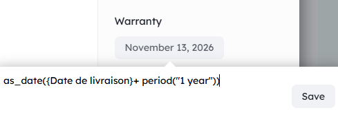 I want to display a warranty end date that must be 1 year after the delivery date (Field “Delivery Date”)