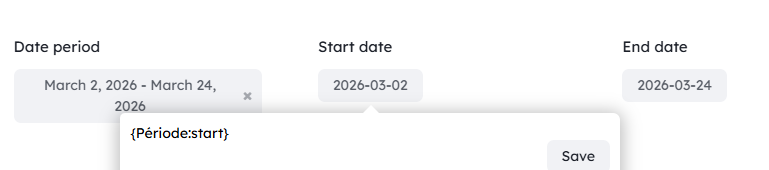 If you use a date field in date range mode, the start of the period corresponds to the expression {Field name: start} and the end of the period to the expression {Field name: end}