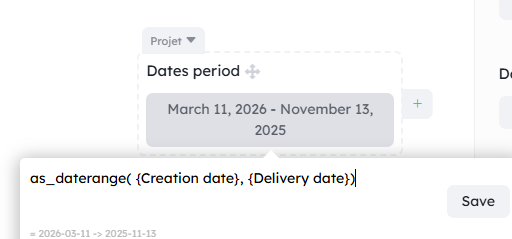 as_daterange({date value 1}, {date value 2}): converts two date fields into one date period value