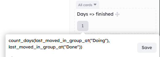 started at: when a card has a state of in progress, the date at which it was started.finished at: when a card has a state of dropped, completed or closed, the date at which it was finished.resolution time: the time between finished at and started atarchived: if the card is archived (yes/no value:archived=yes)archived at: archive date ex : {archived at}>=”2025-01-03”parent: parent card id (used in query like{parent} in {relationship field 1}or{parent}=#14)-