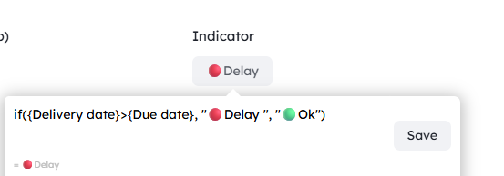 date value : start:select the start date of a date field containing a period example: {date n°2:start}date value : end:select the start date of a date field containing a period example: {date n°2:end}as_number(value): converts a value to a number, for instance as_number({Text field})size(list): returns the size of a list of items, for instance size({assignees})first(value):Get the first value that has been selected in a field with a list of values (Labels)substring(start, count): subtracts the portion of a string from another onesubstring("hello world", 6, 5) = "world"concat(value1, value2, ...): concatenates multiple values togetherround(value, [decimal]): rounds a number to the number of decimals (default: no decimals)-