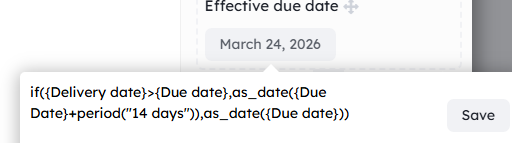 if({Delivery date}>{Due date},as_date({Actual due date}+period("14 days")),as_date({Due date}))